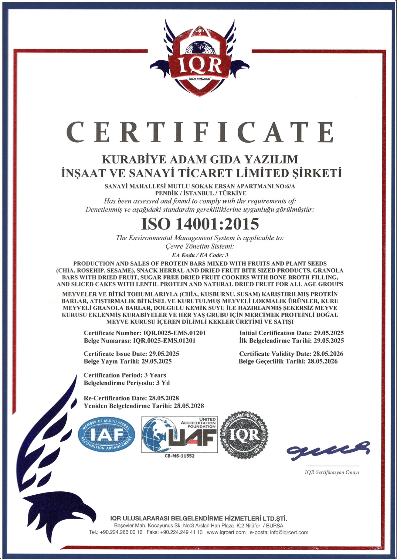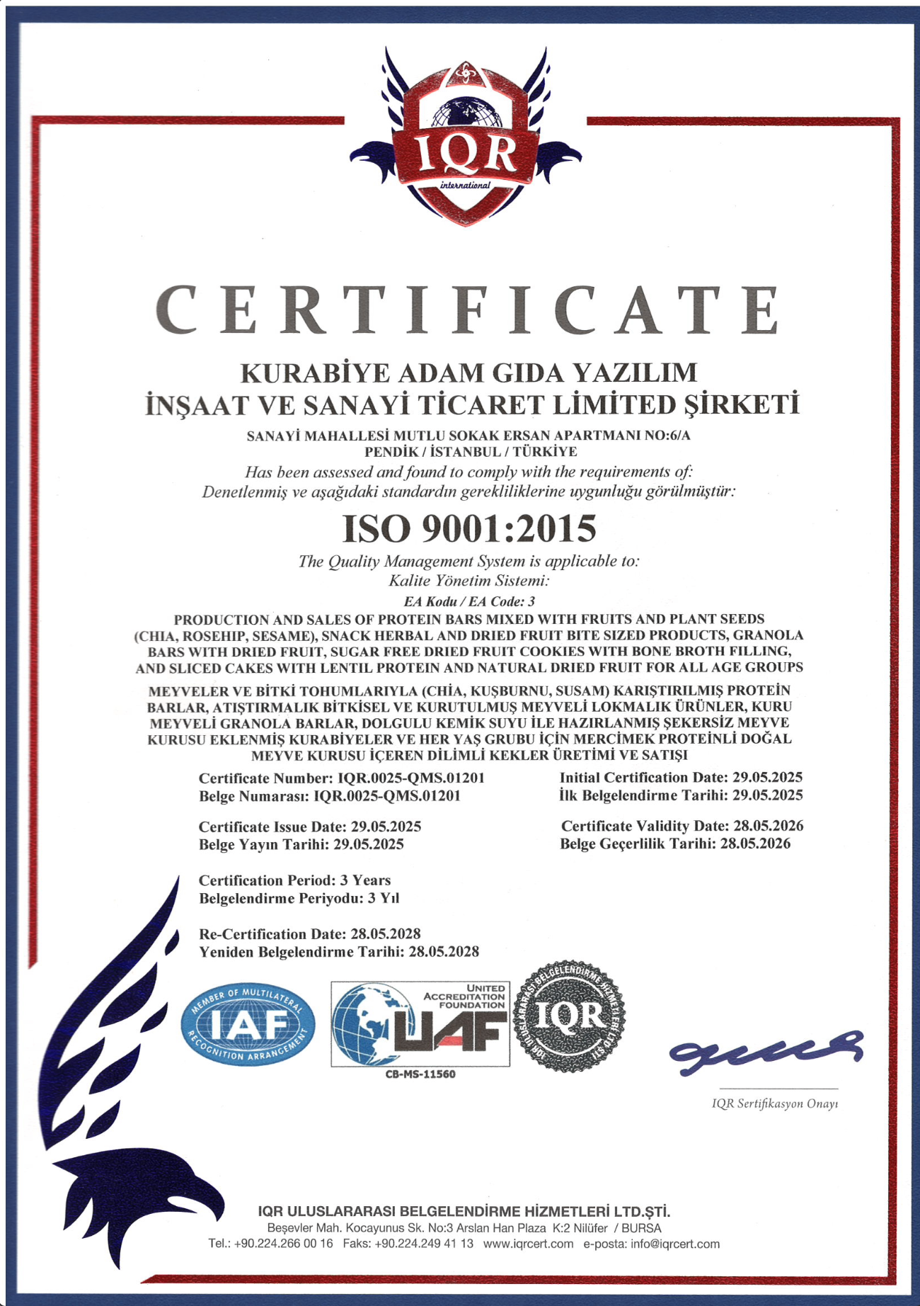 Kurabiye Adam Gıda olarak üretim süreçlerimizi, uluslararası gıda güvenliği standartlarına uygun şekilde yürütüyoruz.